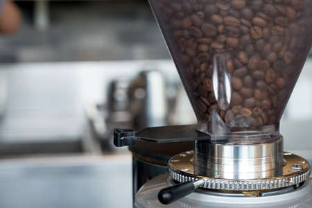 Coffee bean in Coffee grinder machine in coffee shop, close up