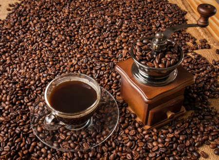 coffee grinder and beans background on sack and cup of coffee