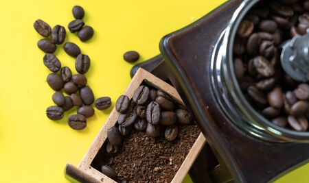 close up selective coffee beans and grinded coffee bean in vintage wooden coffee grinder on yellow background