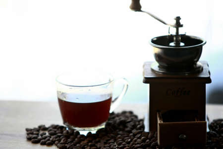 Coffee mill with coffee beans and cup of coffee