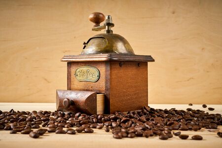Vintage manual coffee grinder with coffee beans on wooden brown background closeup. Coffee Mill with roasted coffee grains.