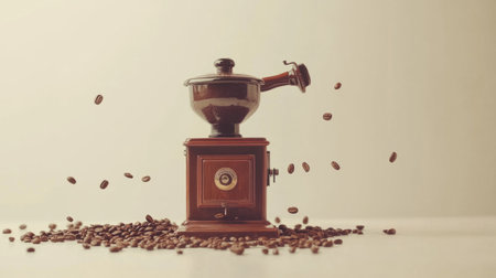 Vintage coffee grinder with beans around it generative ai