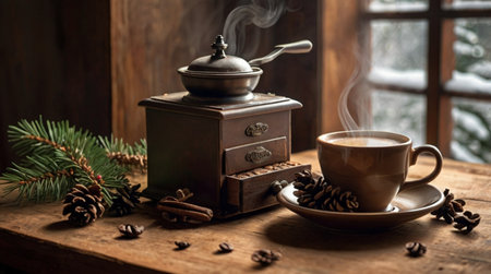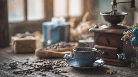 Still life with cup of coffee and coffee grinder