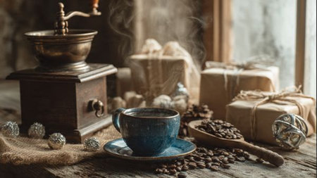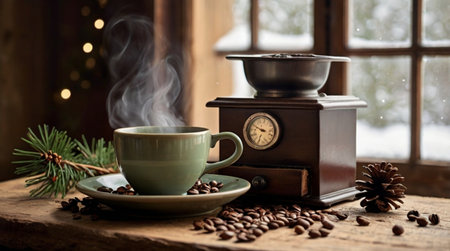 Cozy morning with coffee grinder beans and steaming cup on modern kitchen counter