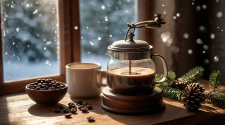 A vintage coffee grinder filled with dark roasted beans emits an inviting aroma, capturing the essence of a timeless brewing ritual in a cozy kitchen atmosphere.