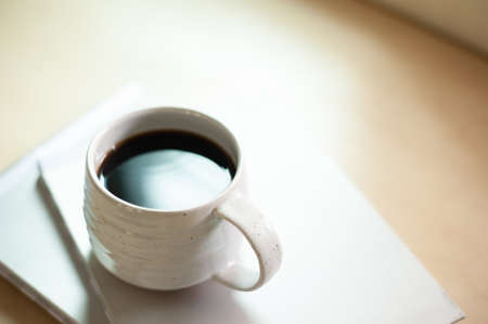Black coffee in crafted cup on book at home