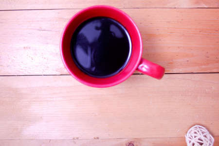 A cup off coffee in red mug. View from top. Wooden palette background