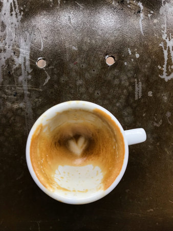 top view fresh coffee with latte art heart on a wooden background with dark vignette