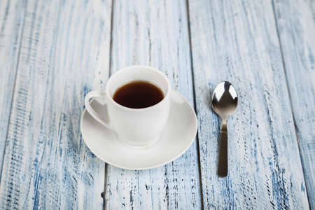 White cup with black coffee on a blue background. Morning breakfast.Empty space for the text. Minimalistic photography.