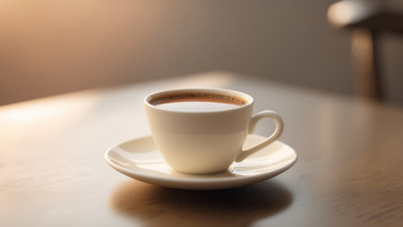 Hot cup of drink on the table in sun light of calm and warm morning.