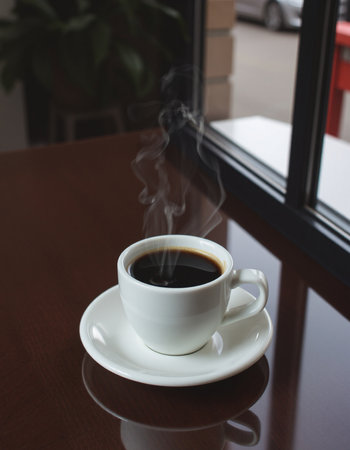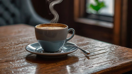 cup of hot coffee with foam and smoke on table in the morning. copyspace for your text