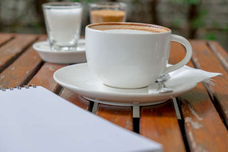 A cup of cappucino, smartphone and notebook on a wooden table in a cafe