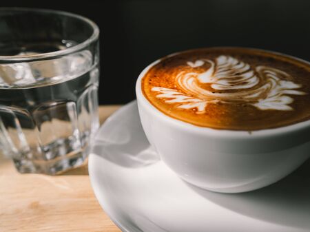 Hot coffee cappuccino latte spiral foam on dark wooden background