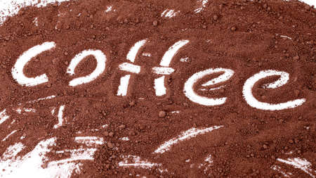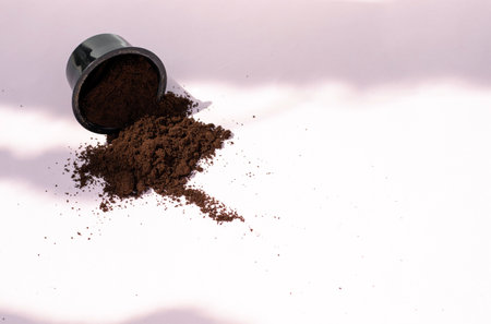 ground roasted coffee sprinkled on white background and white coffee cup close up close-up