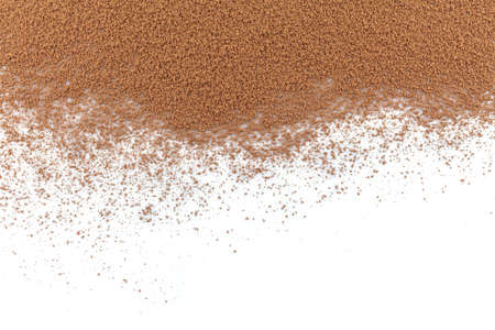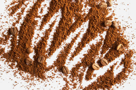 Image of pile of coffee beans and powder over white background. Coffee, refreshment and beverages.