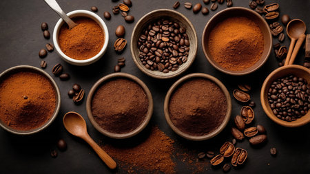 A collection of various coffee beans and ground coffee, showcased in wooden bowls, arranged on a dark, rustic background, highlighting their rich textures and warm colors in a cozy ambiance. AI generated image