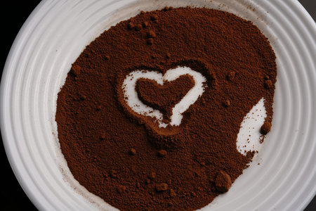 Cocoa powder on a white plate on a black background and a heart painted on it. Top view.