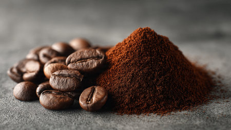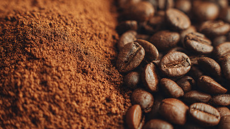 Coffee beans and ground coffee. Close-up. Selective focus.
