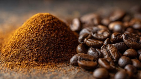 ground aromatic fragrant coffee with spoon texture macro beans background