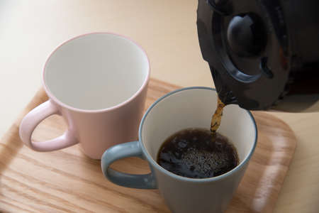 Man pouring dark coffee he made in the morning in cup