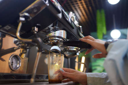 Close-up of espresso pouring from coffee machine, barista coffee preparation service concept.