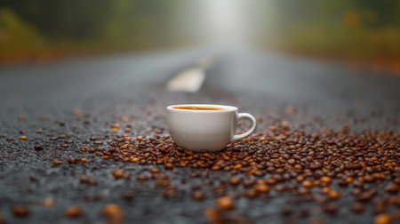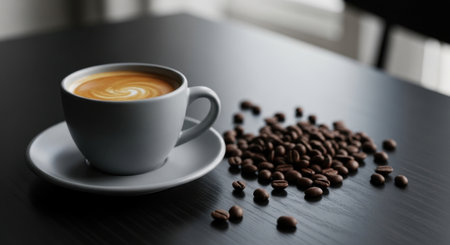 Light grey ceramic coffee mug filled with rich espresso and delicate latte art, accompanied by a pile of roasted coffee beans on a dark surface. perfect for morning, energy, and cafe concepts.