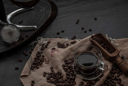 Glass of Black Coffee and roasted coffee beans on the wooden Table