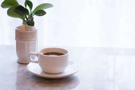 White cup of hot coffee with white plate on the plant green nature background in vintage tone. shallow focus