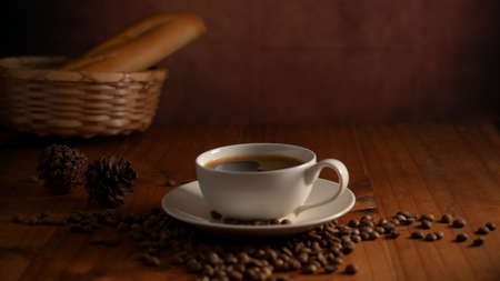 Refresh and energy drink concept. Hot black coffee or espresso in a white ceramic cup with brown cloth table and coffee beans on a dark stone table.