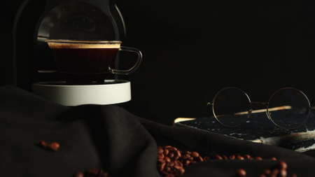 Coffee Americano pouring from coffee machine. Home professional coffee machine with coffee cup.