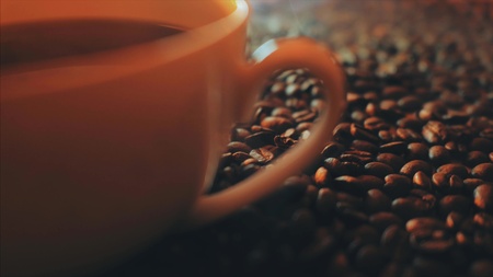 A coffee cup rests on a vibrant background, showcasing a blend of light navy and dark maroon colors. Inside the cup, coffee beans are prominently visible, adding an aromatic touch. The morning light enhances the colors, creating an inviting atmosphere perfect for coffee lovers.