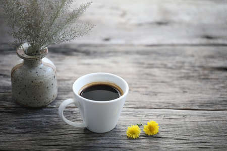 Coffee cup with saucer and spoon on vintage wood surface. Copyspace. Selective focus.
