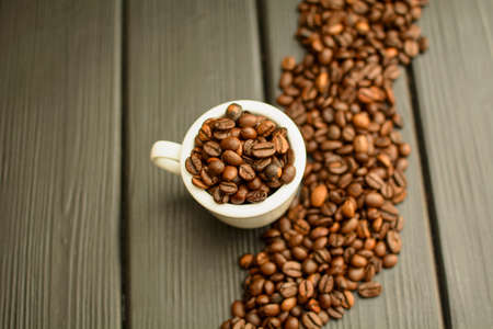 Coffee style, Cup of coffee and coffee beans roating with old wooden scoop and coffee beans around on the wooden and dark stone background. Oblique view from the top with copy space for your text.