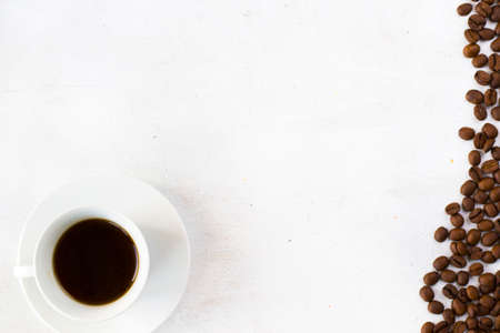 White plate, cup of coffee on a bunch of roasted coffee beans background. High quality photo