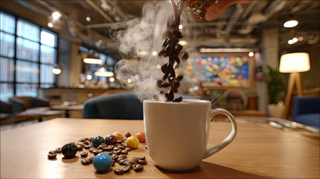 An overhead view captures coffee beans descending into a white mug, generating visible steam. The arrangement includes scattered coffee beans and colorful objects on a wooden table. The scene is illuminated by natural light, suggesting an interior setting, suitable for promotional material.