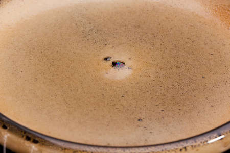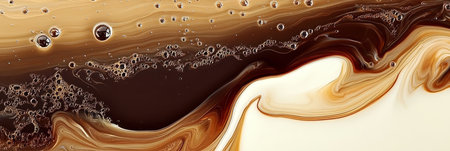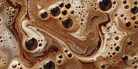 Close up abstract brown caramel shapes latte art in coffee. Liquid texture coffee background macro. Cappuccino and milk foam close up view. High quality photo