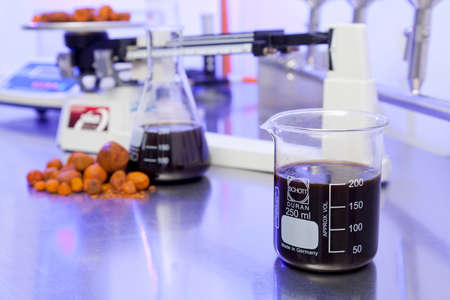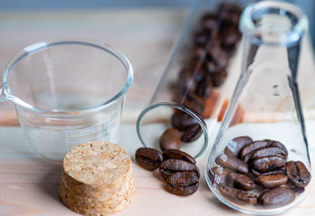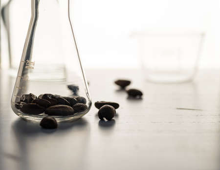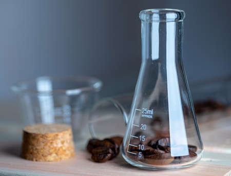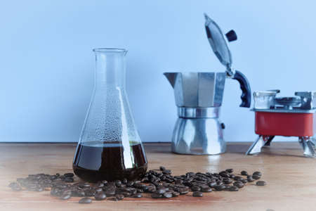 Brewing hot coffee in lab tube with coffee bean on wood table.