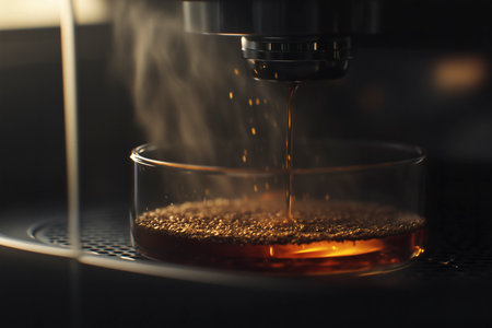 Dark, rich espresso pours into a glass beaker, creating crema. Steam rises, highlighting the process.