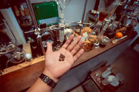 Coffee beans on the hands of a lab researcher For testing the quality of coffee beans used in the beverage industry.