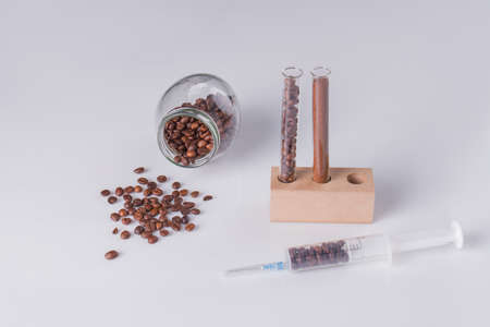 Syringe and glass tubes with coffee beans. Medical syringe full of coffee beans. Isolated on white background.