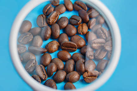 cup of coffee with brown beans on a gray background close-ups macro photography