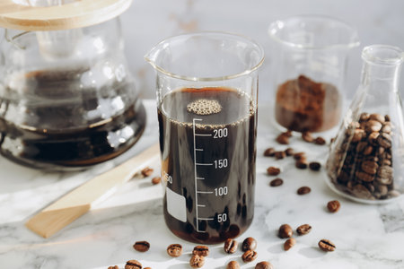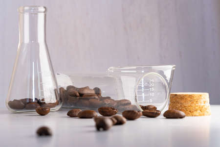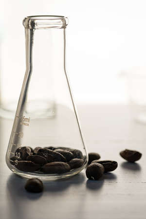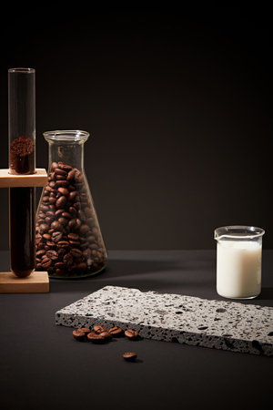 Coffee beans in the erlenmeyer flask, coffee powder in the test tube and milk in the beaker. Mysterious black background. Minimalist space for advertising.