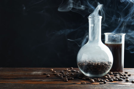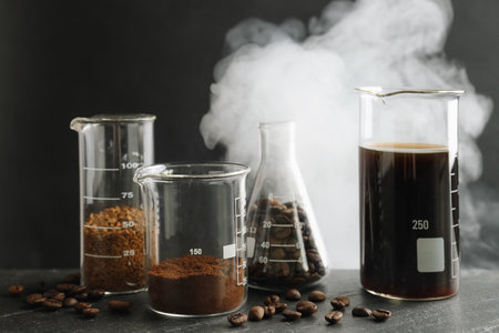 Laboratory glassware with coffee, beans, powder and steam on black table, closeup
