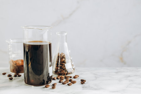 Laboratory glassware with tasty coffee, beans and powder on white marble table, closeup. Space for text