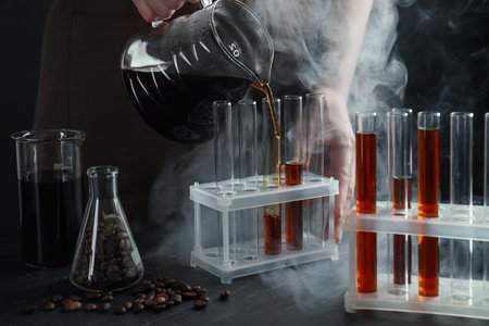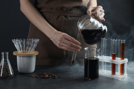 Woman pouring drip coffee into glass test tube at black table, closeup