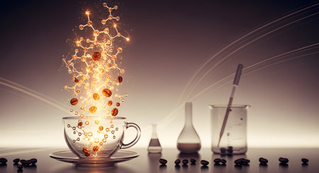 A conceptual image illustrating the science of coffee, where glowing caffeine molecules and coffee beans magically rise out of a clear glass cup. Laboratory glassware in the background reinforces the theme of chemical composition and aroma.