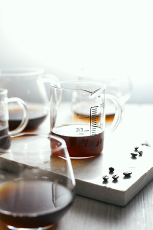 Three small cups display the progression of coffee. One contains ground coffee, another shows dark brewed coffee, and the last holds lighter brewed coffee. Coffee beans add depth.