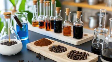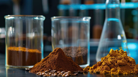 A vibrant arrangement of ground spices and coffee set in laboratory glassware, showcasing the rich textures and colors of culinary ingredients in a kitchen environment.