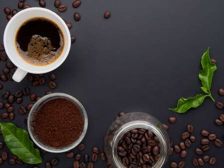 Coffee cup with roasted coffee beans, ground coffee powder and coffee leaves on black background.