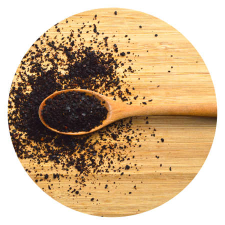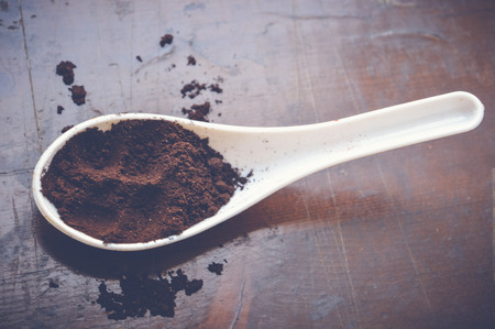 coffee powder on white spoon on wooden table